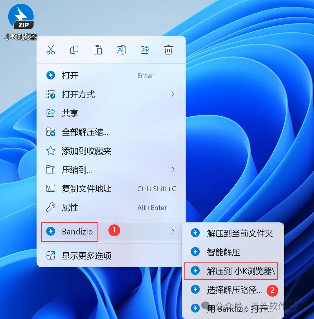 1、下载小K浏览器软件安装包到电脑上,右键选择【解压到小K浏览器\】