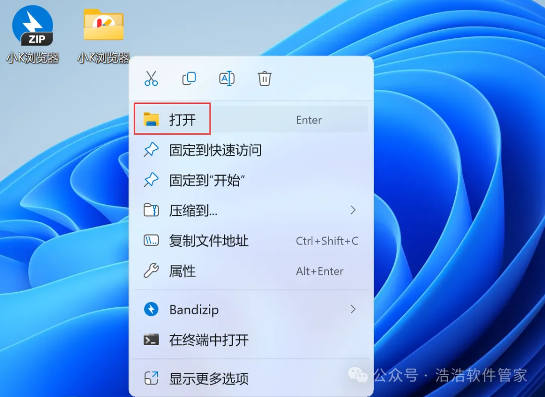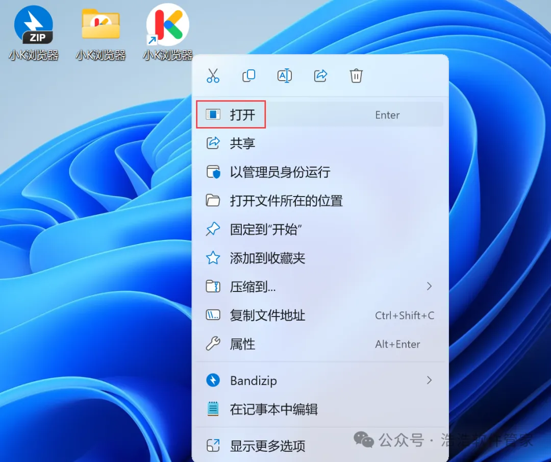 7、回到桌面,右键桌面上的【小K浏览器软件图标】,点击【打开】