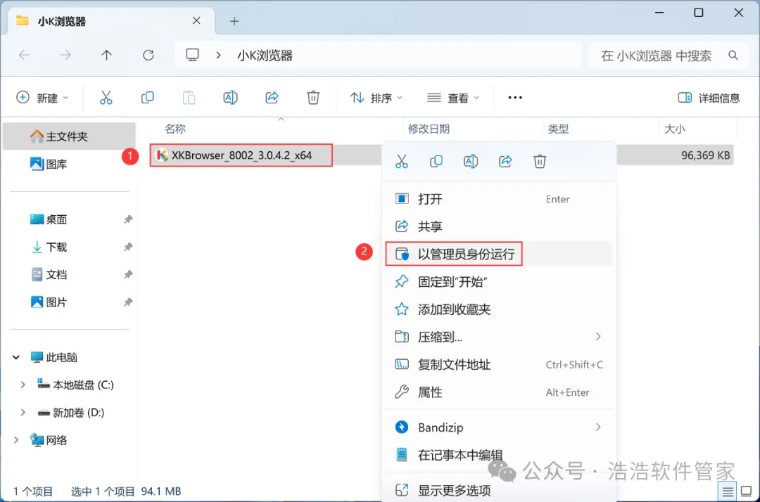 3、找到【小K浏览器】应用程序,右键选择【以管理员身份运行】它