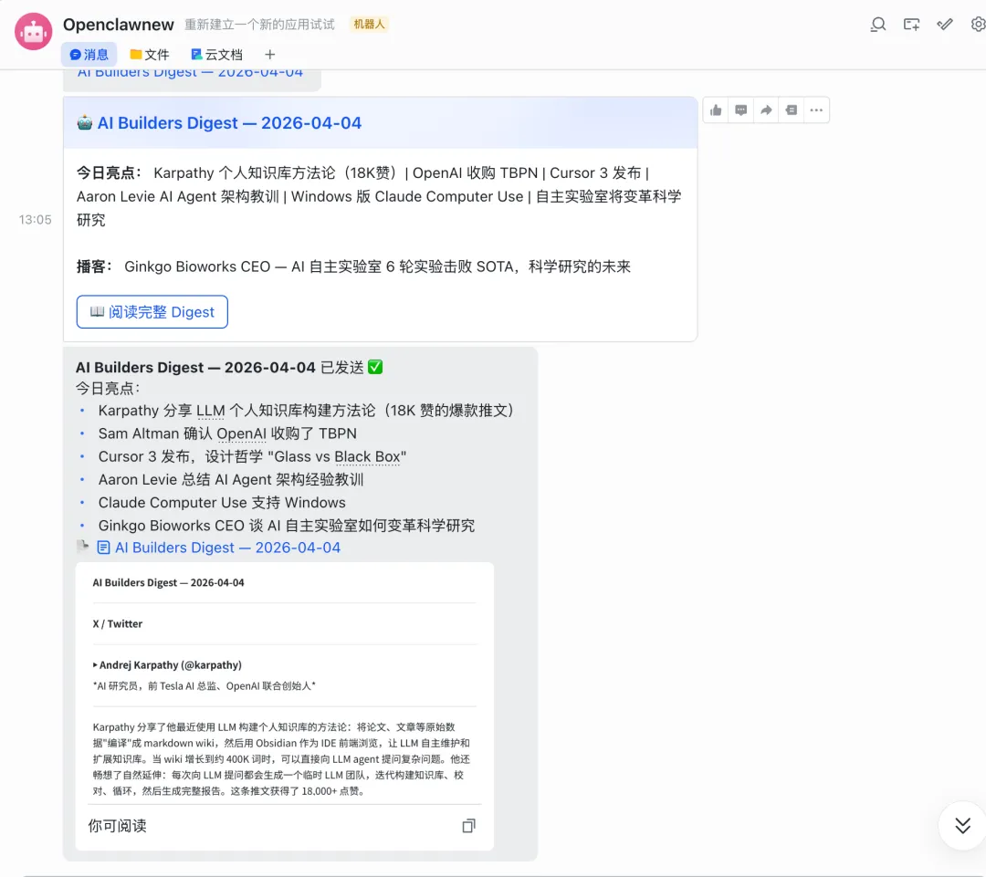 我的 Openclaw 现在基本就干两件事——每天中午帮我跑一份 AI 新闻摘要,再跑一份 AI 圈推文汇总。