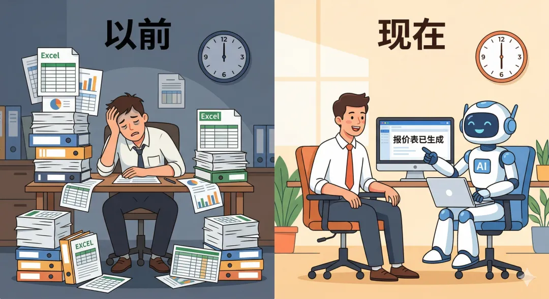 前端的业务同事要从很多供应商的报价表格里面,根据客户的需求——材质、尺寸、价格范围、MOQ、认证要求等等——手动筛选出合适的产品,然后手动做报价表。