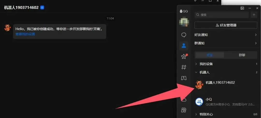 打开QQ → 找到你的机器人 → 发“你好”