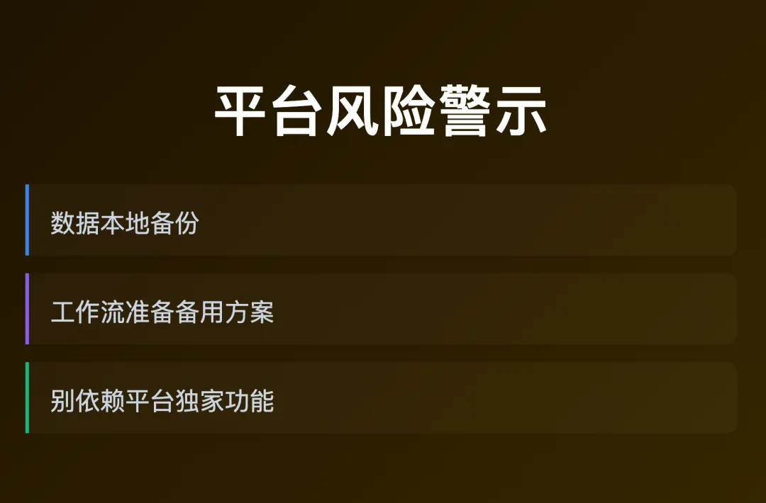 重要的数据,本地备份一份 关键的工作流,准备一个备用方案 别太依赖某个平台的独家功能,因为它随时可能变