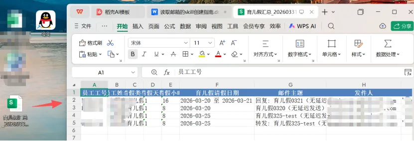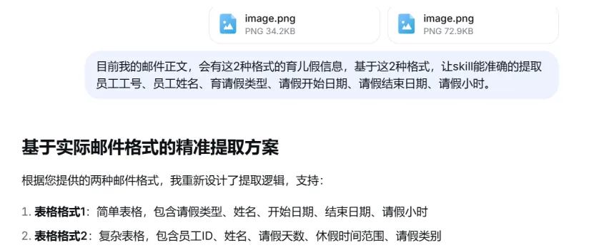 20. 我猜测skill无法精准读取数据,可能是因为我邮件内容的格式千奇百怪,开发(ai)无法智能识别,所以我考虑简化需求,只提供了2种请假的格式,让AI能读取。