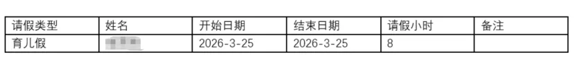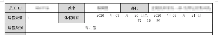 2026-03-27 17:46:11,943 - INFO - ✅ 提取: 姓名=张三, 工号=H01111, 类型=育儿假, 天数=1, 小时=16, 日期范围=