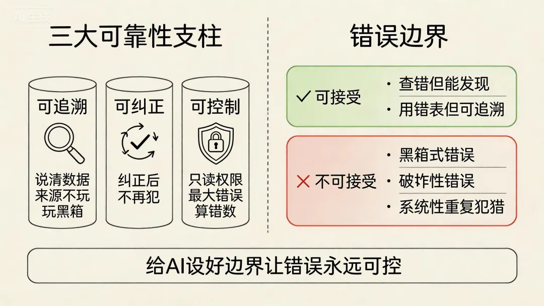 不可接受的:黑箱式的(你不知道它怎么推导的)、破坏性的(删了改了数据)、系统性的(同一个错反复犯)、关键决策类的(基于错误数据做出重大决策)。