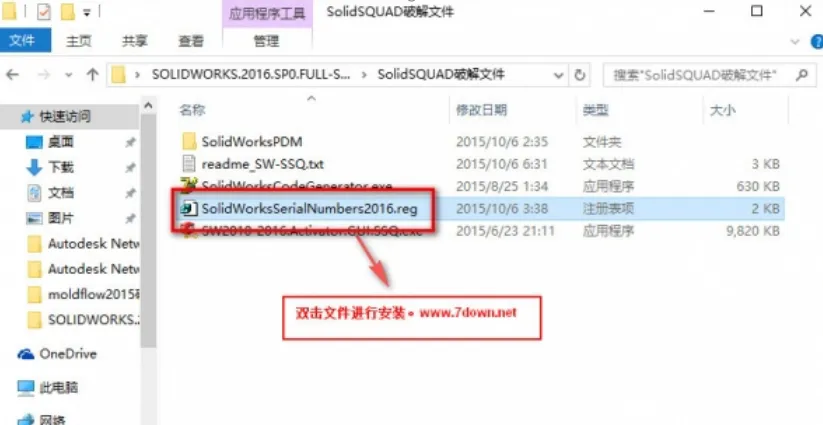 2.下载完成后将文件解压,然后打开破解文件夹solidSQUAD,双击文件夹中的“SolidWorksSerialNumbers2016.reg”注册表进行注册。