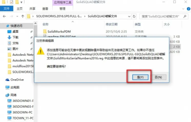 3.此时会提示,添加信息可能会在无意中更改或删除值并导致组件无法继续工作。如果你不信任 X:\XXX......(破解文件路径)\SolidWorksSerialNumbers2016.reg 中此信息的来源,请不要将其添加到注册表中。确定要继续吗?这里选择是。