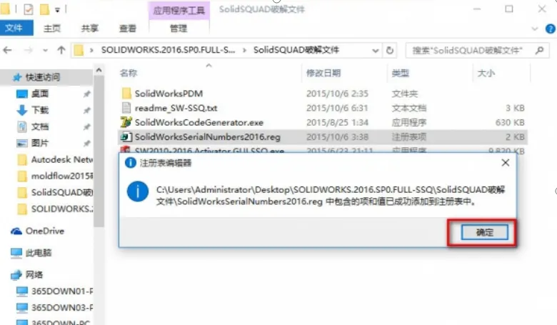 4.此时会提示 X:\XXX......(破解文件路径)\SolidWorksSerialNumbers2016.reg 中包含的项和值已成功添加到注册表中。表示序列号已经成功写入到注册表中了,单机确定即可。