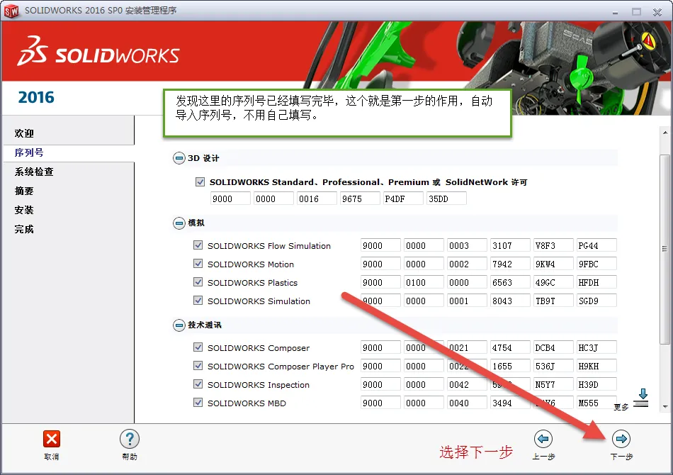 8.在序列号填写界面可以看到序列号已经自动加载了,保留3d设计和模拟下的序列号其他的序列号删掉。此时断开网络,然后点击下一步进行安装。