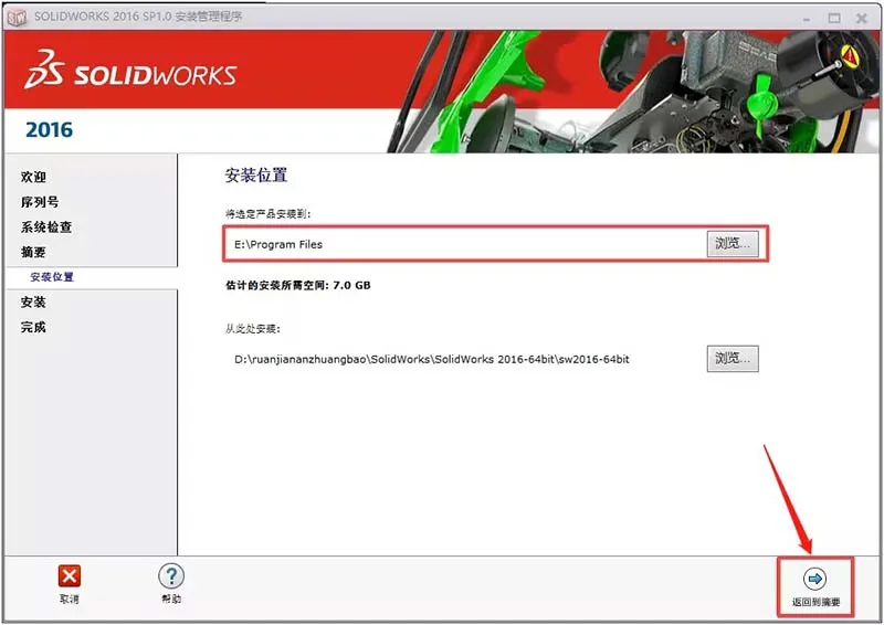 12点击浏览,选择安装目录文件夹,改为D盘即可。再点击【返回到摘要】(如图所示)。