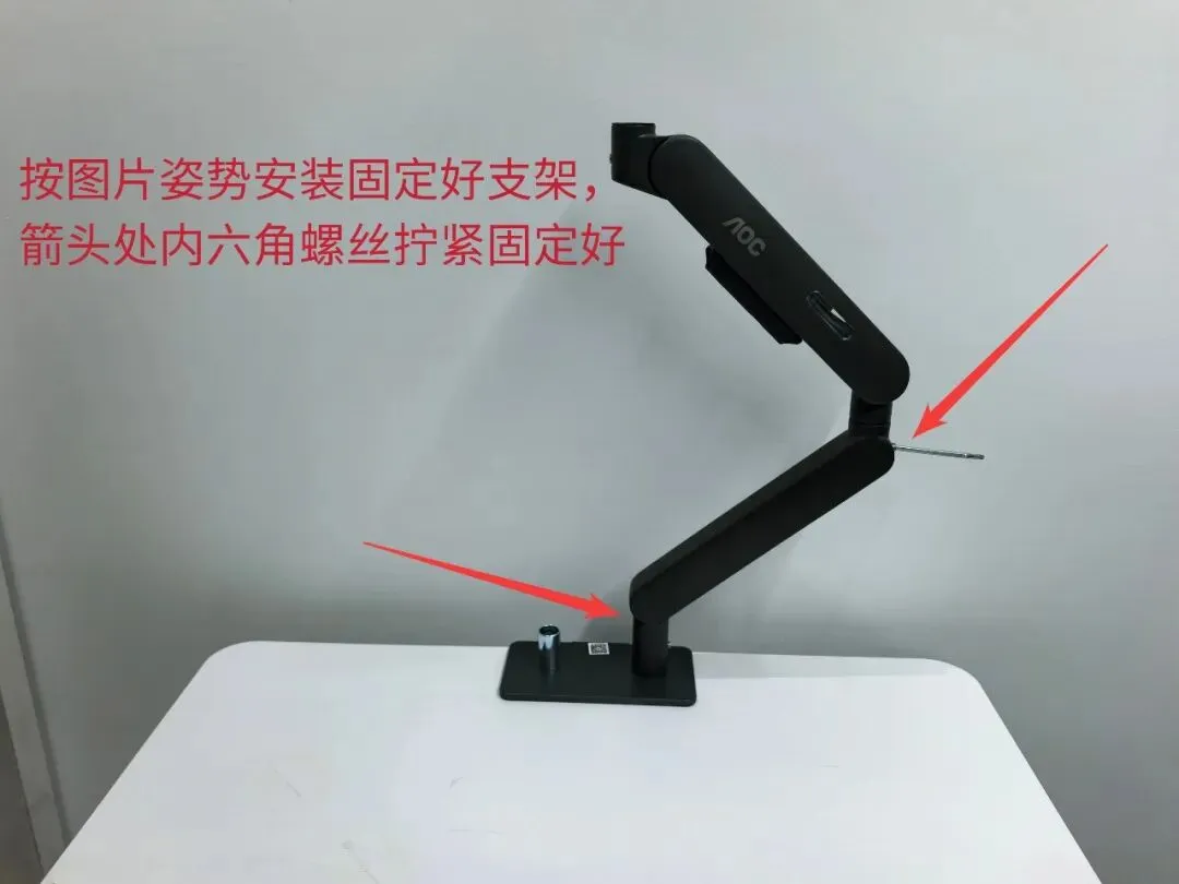 第一步:按图安装好支架,箭头处内六角螺母拧紧固定好支架角度。