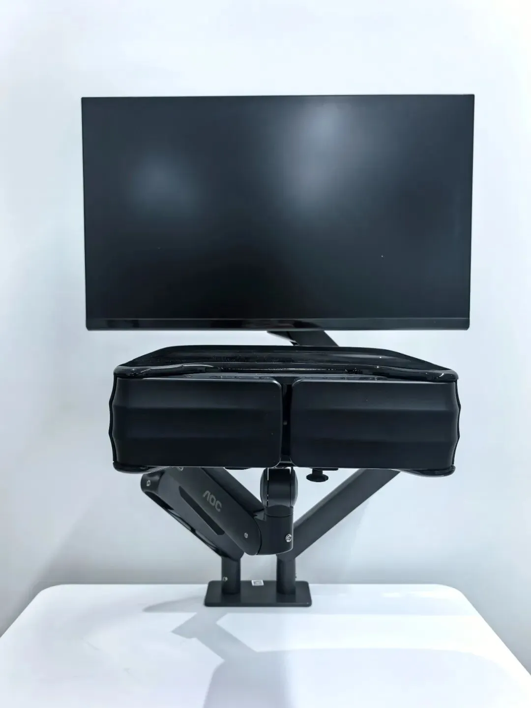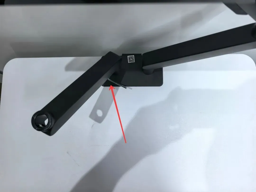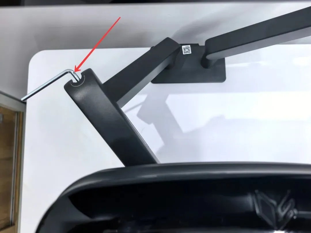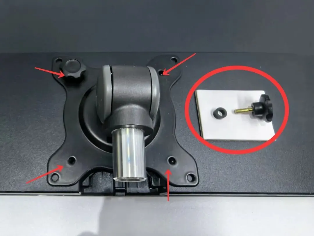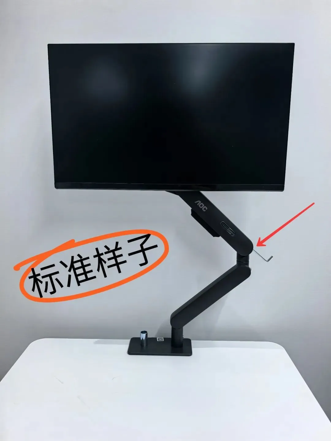 第三步:安装好显示器,①显示器后面支架有内六角螺母固定显示器左右位置,②把显示器抬到最高,箭头处按(+)方向拧5-8圈固定好高度,不垂即可。