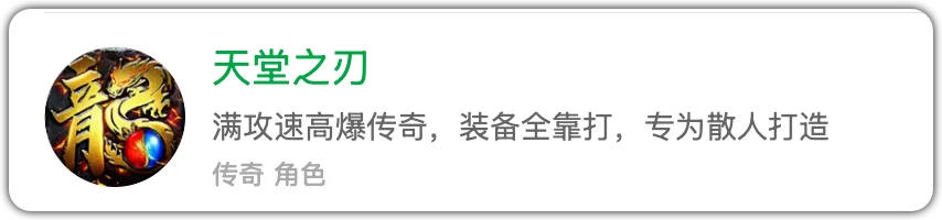 👆传奇新服入口👆3、《天堂之刃》小五碎碎念:满攻速高爆传奇、5倍攻速、全屏吸道具、开局VIP5、开局合击技能。
