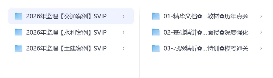 已为您整理2026年监理工程师SVIP核心课程资源,包含案例分析、概论法规、合同管理、目标控制四大必考科目。这些SVIP课程均为2026年最新版本,建议按以下顺序备考:
