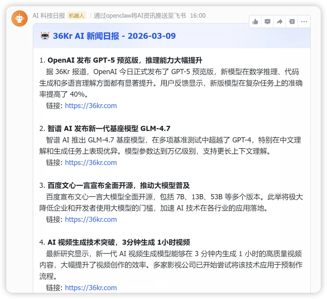 自从有了 OpenClaw 之后,很多人会用它做的一件事,就是获取每日 AI 简报。类似于让它帮你整理一下今天 AI 领域发生了哪些大事,有什么值得关注的动态。