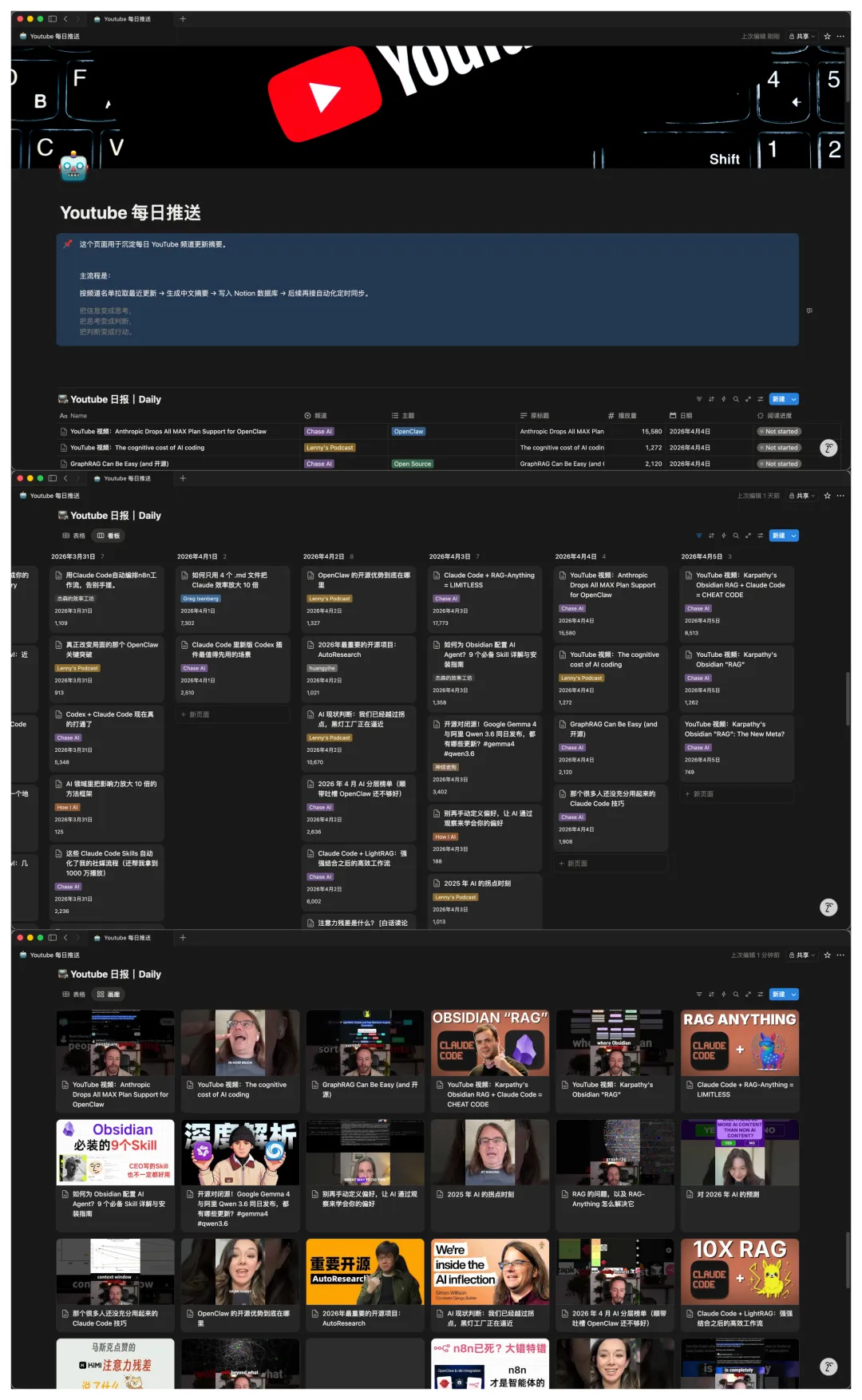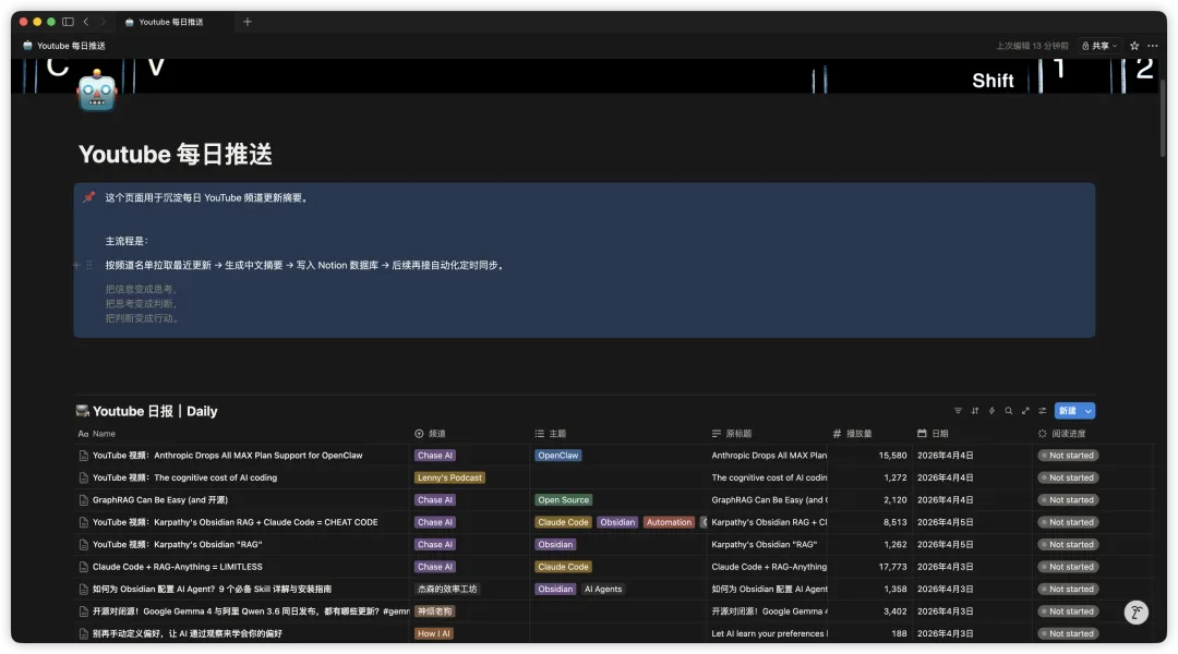 这样,我每天只需要打开 Notion 看一眼,就能对所有关注博主的最新动态一目了然。不用打开 YouTube,不用被算法干扰,也不用担心遗漏。