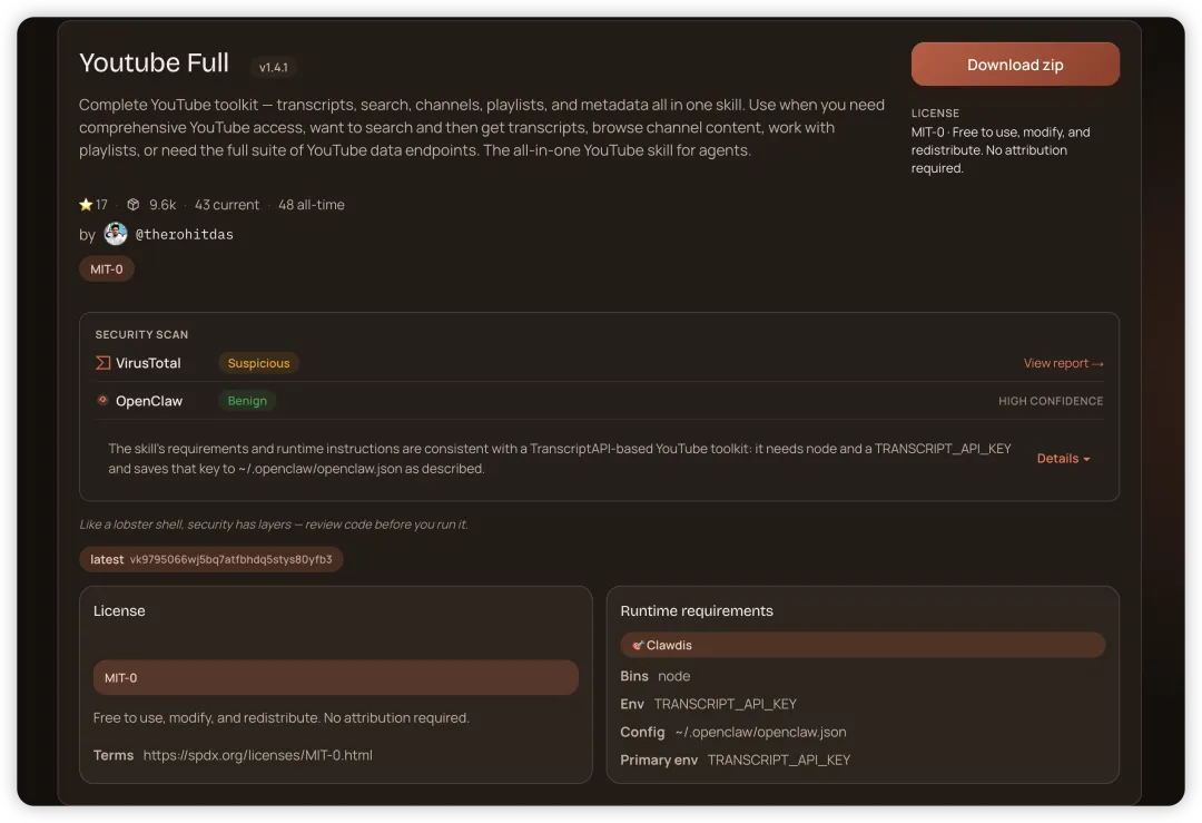 这个 Skills 依赖 TranscriptAPI 来获取 YouTube 视频更新信息。