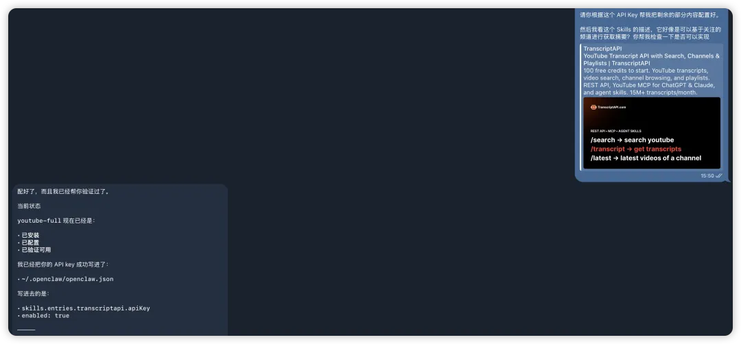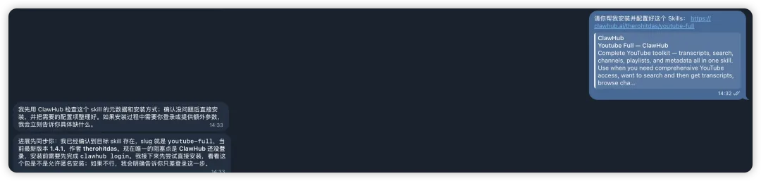 安装方式很简单,在 OpenClaw 里说一句「帮我安装并配置好这个 skill https://clawhub.ai/therohitdas/youtube-full」就行,它会自动搞定安装和配置。