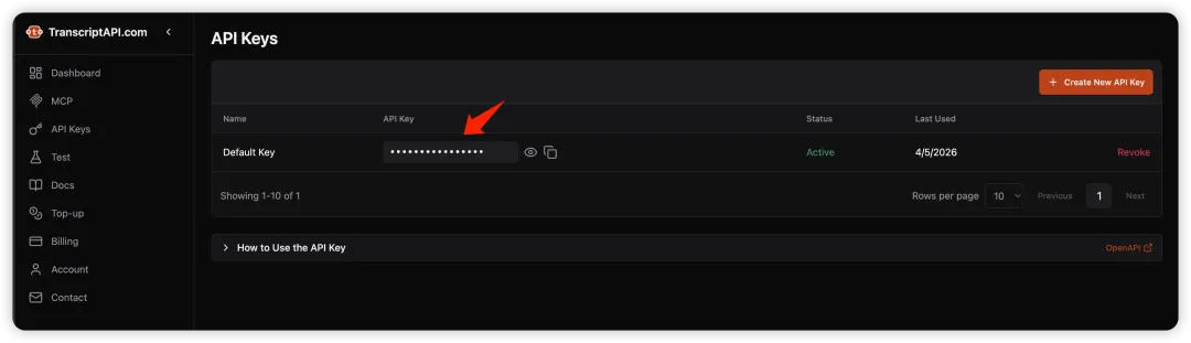 在 TranscriptAPI 后台拿到 API Key。