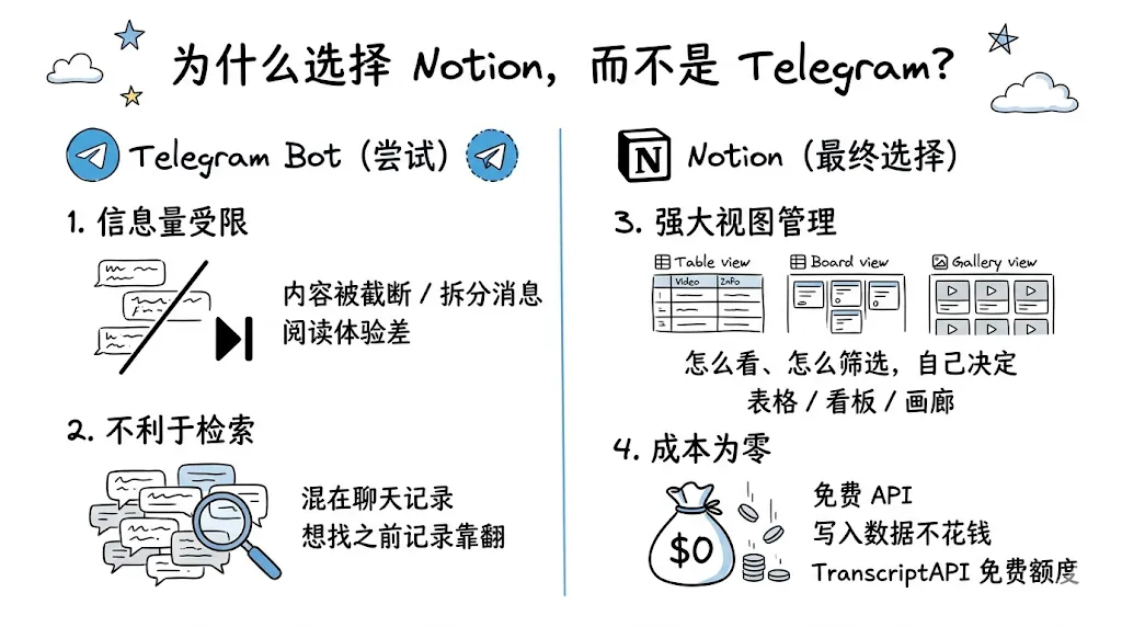 4、成本为零。 Notion 提供免费的 API,写入数据不花钱。加上 TranscriptAPI 的免费额度,整个工作流搭建下来,不需要给第三方充值。