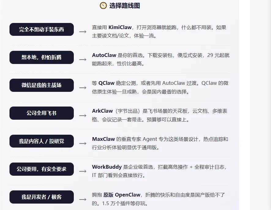 🎯我的建议:普通人先用 KimiClaw(浏览器直接用,感受一下 AI Agent 是什么),然后如果觉得有价值,再根据上面的决策树切换到更适合自己场景的版本。不需要一步到位。