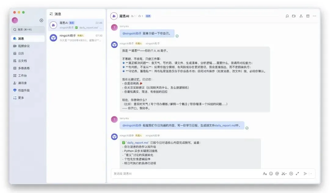 你当然可以为每个平台分别实现一个机器人,但问题在于:对话会被割裂,记忆也会分散——飞书上的AI,并不知道你在其他地方说了什么。