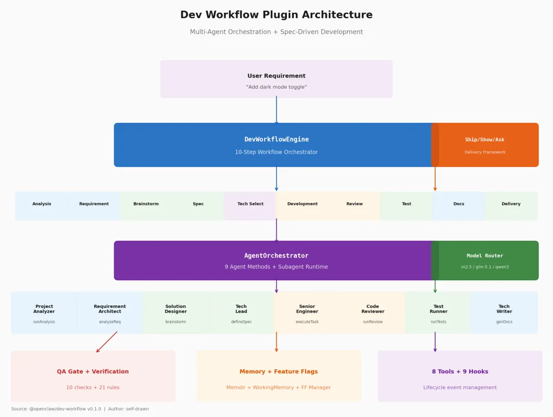 @openclaw/dev-workflow 插件的核心价值在于将 AI 编码从「对话式」升级为「工程化」:通过规格定义确保设计先行,通过多智能体编排实现角色分工,通过 QA 质量门保障代码质量,通过 Ship/Show/Ask 框架实现安全交付。
