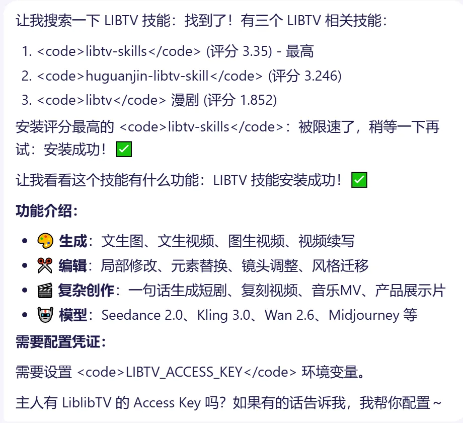 通过 OpenClaw + LIBTV 技能,我们实现了: