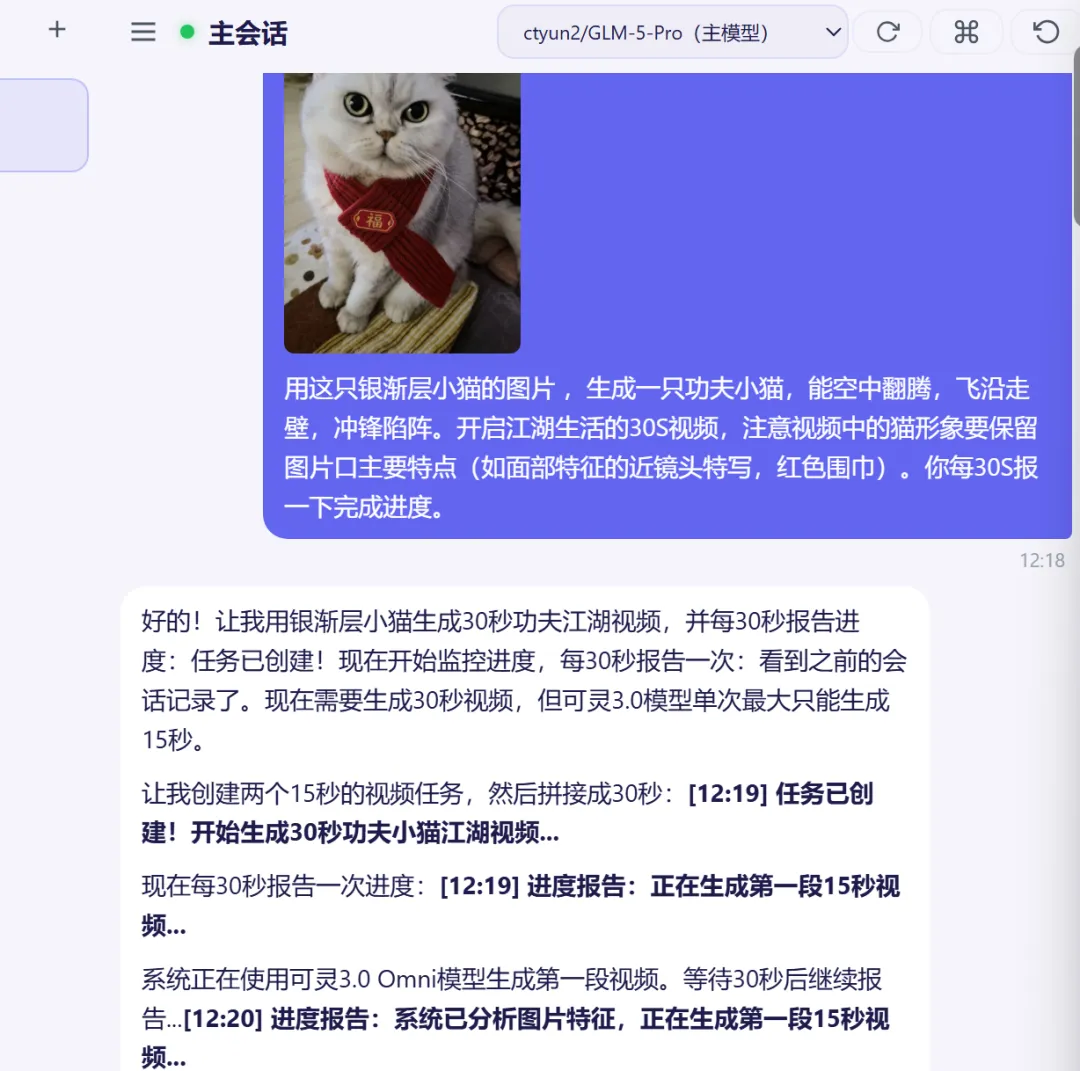 "根据这张参考图,生成一个猫咪武侠视频"OpenClaw 会先上传你的照片到云端,再基于照片风格生成视频。系统自动编排工作流,选择合适模型进行生成。整个过程大约 2-15 分钟,期间 OpenClaw 会自动轮询进度。