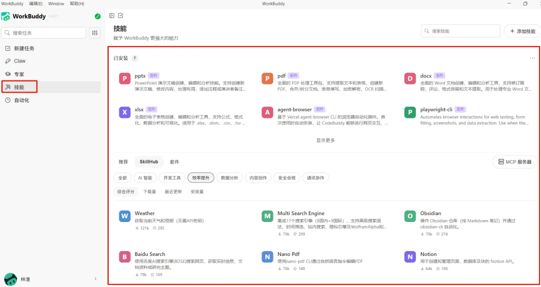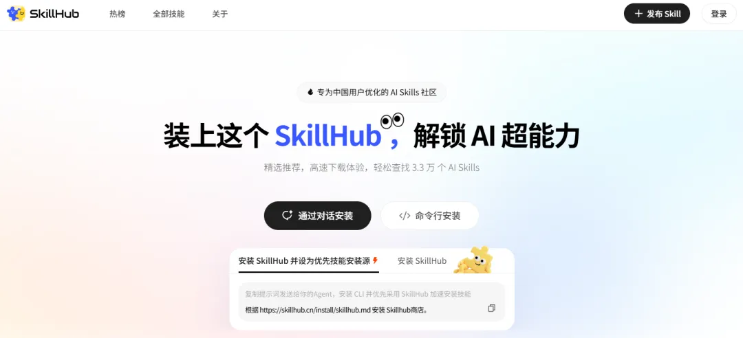 腾讯云推出的国内加速版,界面全中文,下载体验不错,操作也贴合国内小白的使用习惯,不用懂英文,轻松找到自己需要的Skill。