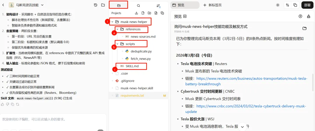 在生成技能的后台,可以看到Perjects,其中的musk-news-helper就是skill文件