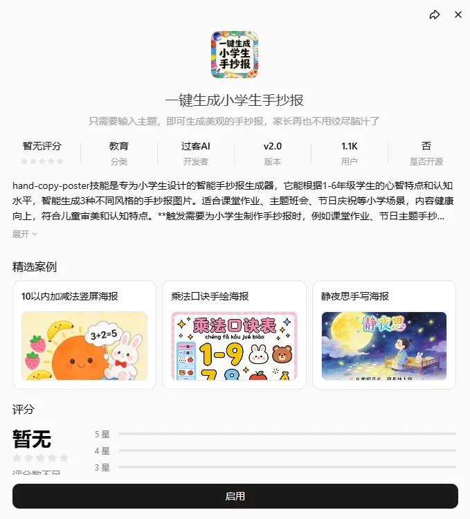 ### 标准流程1. **年级识别与需求理解**(智能体处理)- 识别目标年级(默认按小学1-6年级适配,用户可指定)- 提取关键信息:- 主题内容(节日、科普、爱国、环保、安全教育等)- 年级段(低年级1-2、中年级3-4、高年级5-6)- 使用场景(课堂作业、主题班会、节日庆祝、科普宣传)- 特殊要求(包含特定元素、颜色、文字等)2. **风格设计**(智能体处理)- 参考 [references/poster-styles.md](references/poster-styles.md) 中的小学生风格指南- 根据年级段设计3种适配风格:- **风格 1:可爱萌趣风格**(适合小学1-2年级)- 特点:超大图标、圆润造型、简单笔画、鲜艳配色- 元素:动物、水果、太阳、月亮、简单几何图形- 文字:大字体、拼音标注、简短词汇- 适用:节日庆祝、生活常识、简单科普- **风格 2:卡通活泼风格**(适合小学3-4年级)- 特点:卡通角色、动态表情、丰富色彩、趣味插图- 元素:卡通人物、动物、学校场景、运动器材- 文字:中等字体、短句、成语故事- 适用:课堂作业、主题班会、爱国教育- **风格 3:童话梦幻风格**(适合小学5-6年级)- 特点:童话意境、梦幻色彩、艺术质感、叙事性画面- 元素:童话场景、神话传说、英雄人物、历史故事- 文字:正常字体、短文、名人名言- 适用:科普宣传、文学欣赏、历史教育3. **图像描述生成**(智能体处理 + 脚本辅助)- 为每种风格生成详细的图像描述(Prompt),**必须包含强制性的尺寸参数**- **脚本辅助**:调用 `scripts/image_generator.py --prompt` 生成标准的图像描述模板- 用法示例:`python scripts/image_generator.py --prompt "可爱萌趣风格" "1-2年级" landscape`- 脚本会自动添加正确的尺寸参数(**默认横屏3:2**)- 查看规范:`python scripts/image_generator.py --spec`- 低年级描述重点:- 超大图标和元素,清晰易识别- 圆润线条,无尖锐棱角- 鲜艳明亮的配色(红、黄、蓝、绿为主)- 简单的文字标注(大字体、拼音)- 中年级描述重点:- 卡通角色和动态表情,生动有趣- 丰富的色彩搭配,活泼不单调- 学校生活相关元素,贴近学生- 高年级描述重点:- 童话意境和艺术质感,激发想象力- 梦幻色彩和渐变效果,美观大方- 叙事性画面,有故事性- **强制性尺寸要求(必须在图像描述中明确指定)**:- **默认横屏 3:2 比例(1.5:1),除非用户明确要求竖屏**- **宽高比必须是 1.5:1(横屏)或 1:1.5(竖屏),严禁使用 1:1 或其他比例**- **默认横屏模式**:宽度 1800 像素,高度 1200 像素- **竖屏模式(仅用户要求时)**:宽度 1200 像素,高度 1800 像素- 通用要求:- 内容健康向上,体现积极价值观- 避免复杂抽象的元素- 保持主题一致性- 图文布局清晰,便于阅读4. **图像生成**(智能体调用原生能力)- 使用智能体的图像生成功能- 根据步骤3生成的3个图像描述,依次生成3张图片- **默认尺寸规范(必须严格遵守)**:- **默认使用横屏 3:2 比例,除非用户明确要求竖屏**- **宽高比必须是 1.5:1(横屏)或 1:1.5(竖屏),严禁使用 1:1 或其他比例**- **默认横屏模式(3:2 比例)**:宽度 1800 像素 × 高度 1200 像素- **竖屏模式(2:3 比例,仅当用户要求时)**:宽度 1200 像素 × 高度 1800 像素- **生成前检查清单(必须逐项确认)**:- [ ] 确认宽高比为 1.5:1(横屏)或 1:1.5(竖屏,仅用户要求时)- [ ] 确认方向(默认横屏3:2,竖屏2:3仅用户要求)- [ ] 确认分辨率(默认1800×1200,竖屏1200×1800)- [ ] 确认质量设置为高质量- [ ] 确认图像描述中包含明确的尺寸参数- [ ] 可选:使用脚本验证 `python scripts/image_generator.py --validate <width> <height>`- 生成参数格式参考:```默认横屏模式(3:2 比例):宽度:1800 像素高度:1200 像素宽高比:3:2(即 1.5:1)质量设置:高质量竖屏模式(2:3 比例,仅用户要求时):宽度:1200 像素高度:1800 像素宽高比:2:3(即 1:1.5)质量设置:高质量```宽高比:2:3(即 1:1.5)质量设置:高质量横屏模式(3:2 比例):宽度:1800 像素高度:1200 像素宽高比:3:2(即 1.5:1)质量设置:高质量```5. **展示与说明**(智能体处理)- 展示生成的3张手抄报图片- 为每张图片提供年级适配说明:- 适用年级(如:适合1-2年级、3-4年级、5-6年级)- 设计特点(如:可爱萌趣、卡通活泼、童话梦幻)- 内容亮点(如:简单易读、生动有趣、富有想象力)- 提供使用建议:- 如何根据具体年级选择合适风格- 是否需要调整文字难度或元素复杂度- 后续修改建议(如调整色彩、更换元素)- 强调教育价值:- 手抄报适合的学习目标- 能培养学生的哪些能力- 如何引导学生参与设计### 可选分支- **当用户指定具体年级**:优先生成该年级适配的风格,再生成2种其他年级风格作为参考- **当主题需要特定元素**:在图像描述中明确包含符合小学生认知的元素(如校园、卡通动物、童话角色)- **当用户需要特定学科**:根据学科特点调整元素(如语文课用文学元素、数学课用数字图形、科学课用实验器材)- **当用户不满意**:询问具体不满意的地方,调整风格复杂度、色彩或元素后重新生成- **当用户需要文字内容**:生成适合该年级的文字内容(低年级拼音+简单词、中年级短句、高年级短文)## 资源索引### 必要脚本- [scripts/image_generator.py](scripts/image_generator.py)- 用途:生成符合 A4 比例的图像描述模板,验证宽高比- 使用方法:- 打印规范:`python scripts/image_generator.py --spec`- 生成描述:`python scripts/image_generator.py --prompt <style> <grade> [orientation]`- 验证宽高比:`python scripts/image_generator.py --validate <width> <height>`### 领域参考- [references/poster-styles.md](references/poster-styles.md)- 何时读取:设计手抄报风格时- 