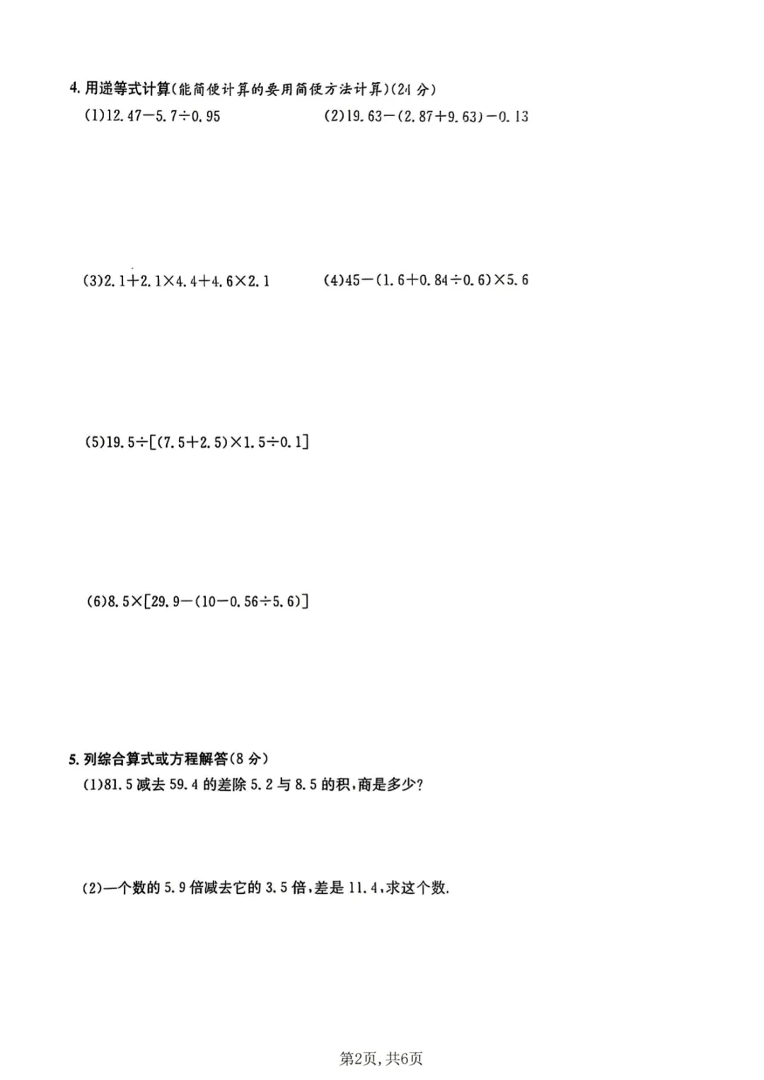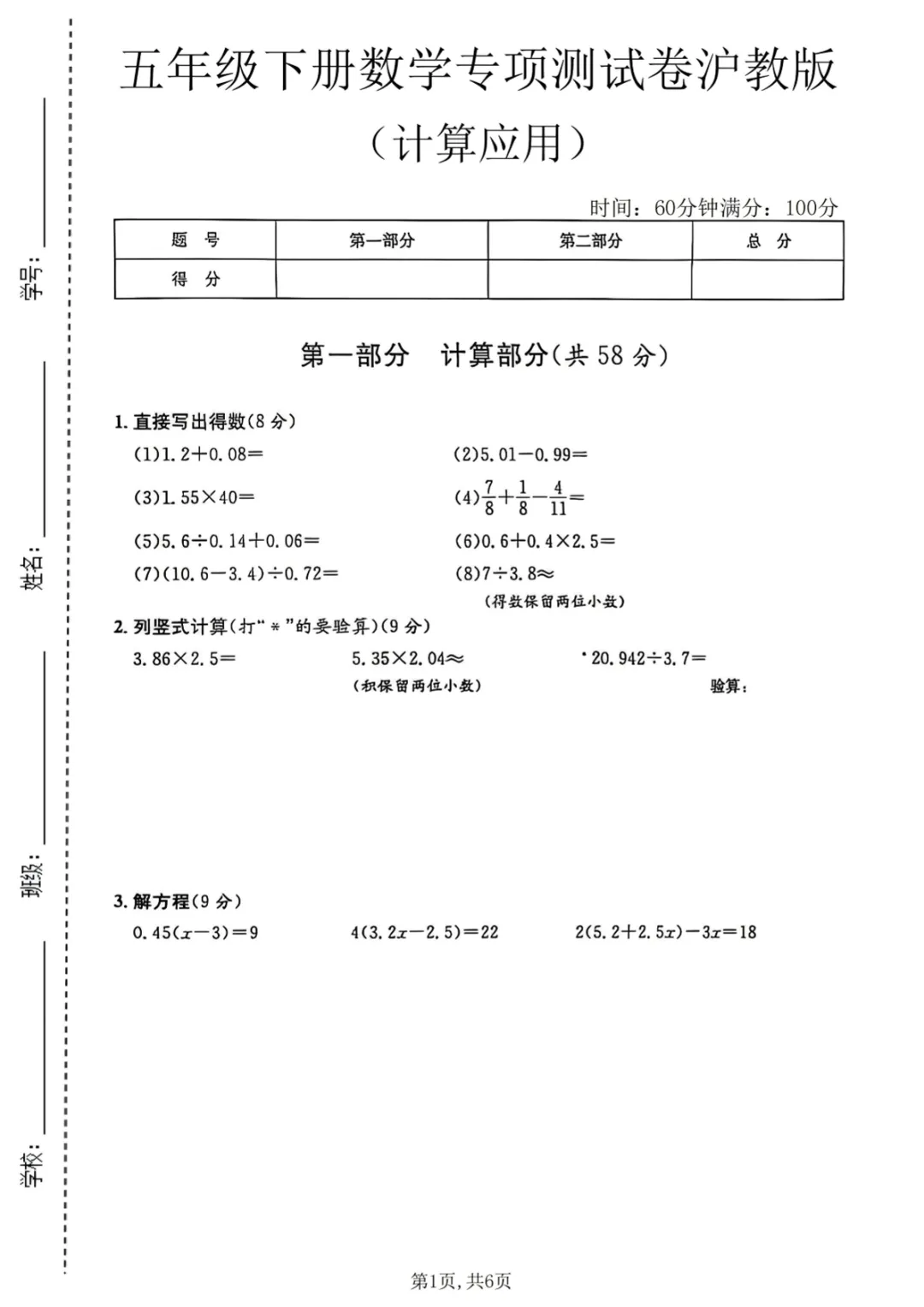 【免费下载】五年级(下)数学 计算应用专项测试卷1《沪教版》,PDF电子版,共6页,先保存,以免资源失效