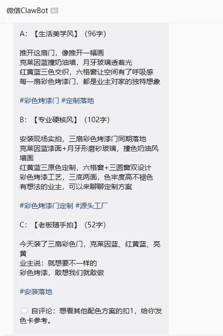 客户是做门定制的源头工厂,每天要在微信发朋友圈营销。车间实拍、安装现场、客户好评、发货晒单……图片拍了,但文案不知道怎么写。只会说"又装完一套"、"今天发货"。