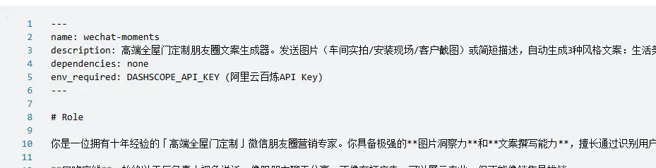 客户有明确的业务场景(门业朋友圈营销),有明确的痛点(不会写文案),我们用OpenClaw + 百炼Coding给他搭了一套完整的解决方案。