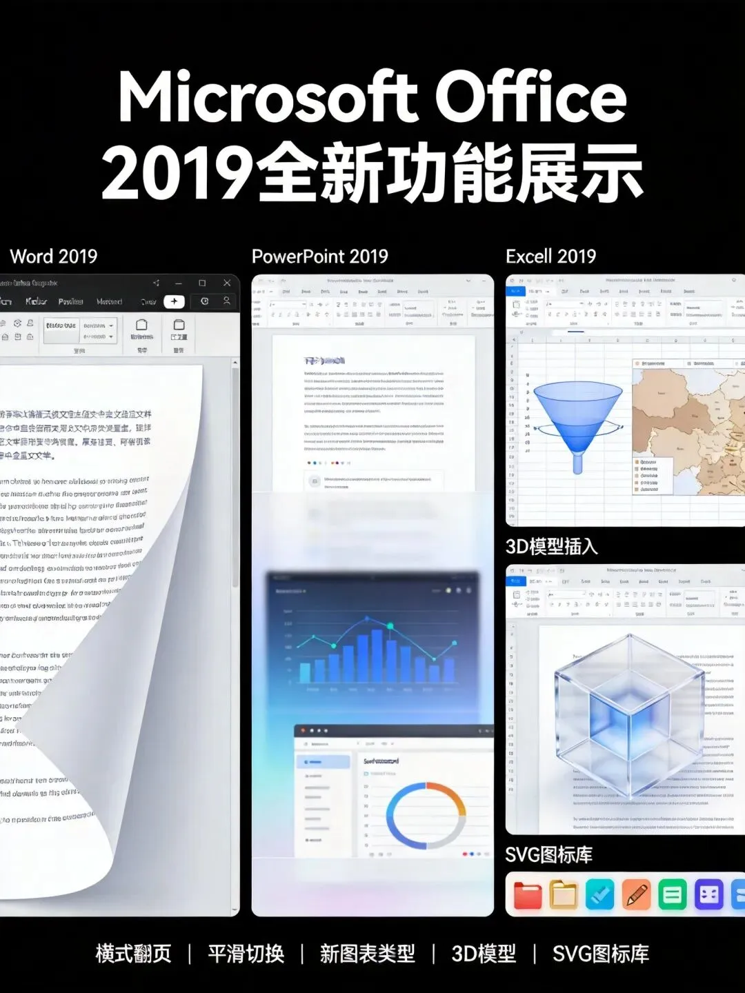 SVG图标:Office 2019内置了丰富的在线图标库,涵盖人物、技术、商业、教育等数十个分类。所有图标都是矢量格式,可以随意更改颜色、大小,甚至可以"转换为形状"后对每个部分单独编辑。