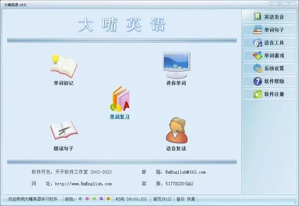 从认字母、学音标开始,真正零基础起步。内容巨全:英语900句、电话英语、商务英语、求职英语、社交英语、走遍美国、疯狂英语900句、新概念英语(全套四册) 等39大类共30000多句常用对话,初中高中课文也全包了。背单词部分精选了 小学到大学、四六级、考研、职称、出国考试、新概念、许国璋 等17大类150多本书、18万词汇,部分带例句、英义、助记法,还有卡通人物和中英文语音朗读。