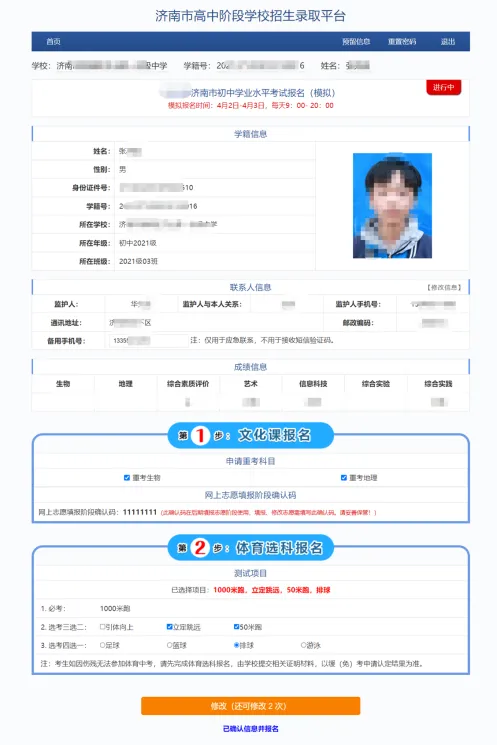 毕业年级的报名包括文化课考试报名以及体育中考报名两部分内容,在同一页面完成。