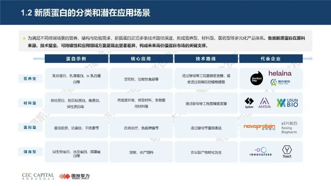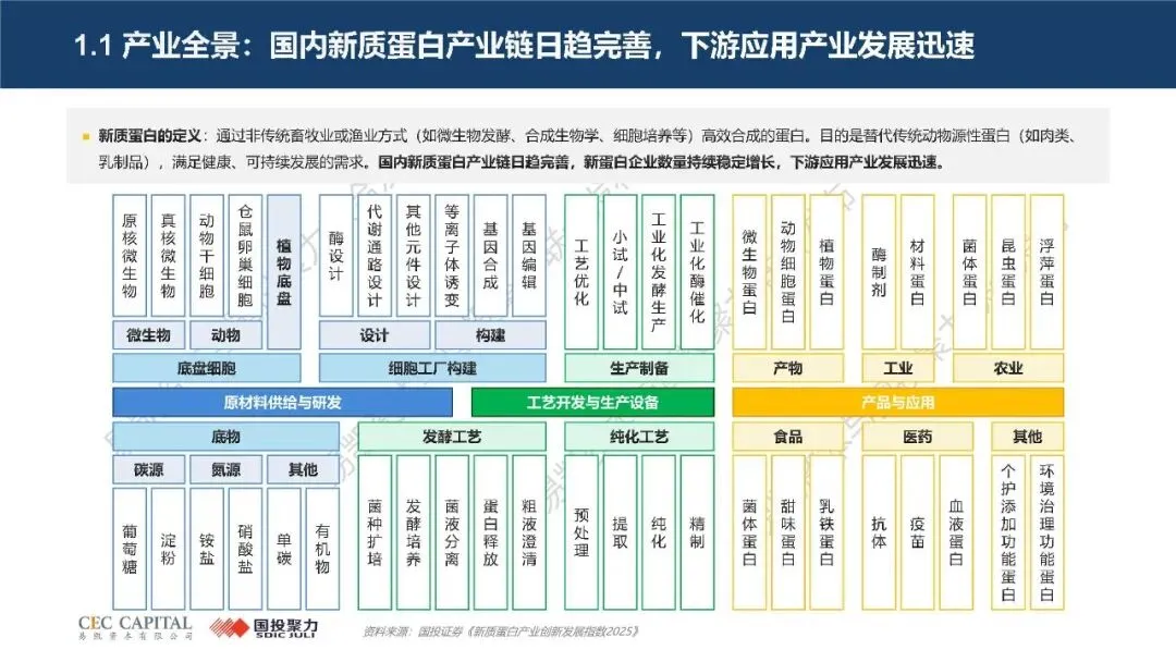 新质蛋白的定义:通过非传统畜牧业或渔业方式(如微生物发酵、合成生物学、细胞培养等)高效合成的蛋白。目的是替代传统动物源性蛋白(如肉类、乳制品),满足健康、可持续发展的需求。国内新质蛋白产业链日趋完善,新蛋白企业数量持续稳定增长,下游应用产业发展迅速。