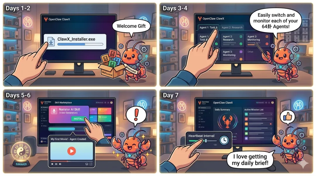 先装ClawX:按照官方指引安装桌面客户端(比纯命令行友好太多)。 连接现有OpenClaw:ClawX会自动识别本地OpenClaw实例。 初始化SIMIAIOS:在ClawX面板中一键激活64卦虾群。 第一周目标: 熟悉多Agent管理界面 一键安装Narrator AI Skill,生成第一条影视解说视频 设置每日简报,体验心跳驱动的主动性 进阶玩法:用ClawX图形化调整MCP协作规则、监控资源占用、批量管理Skill。