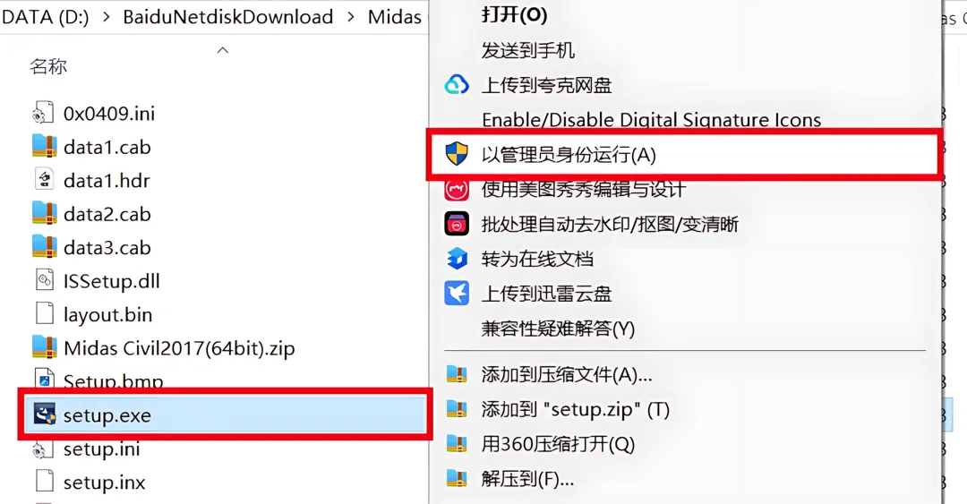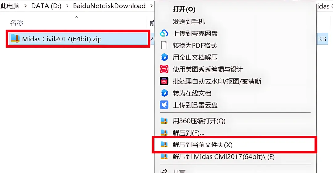 1.下载Midas Civil 2017软件安装包到电脑上,右键选择【解压到当前文件夹】。