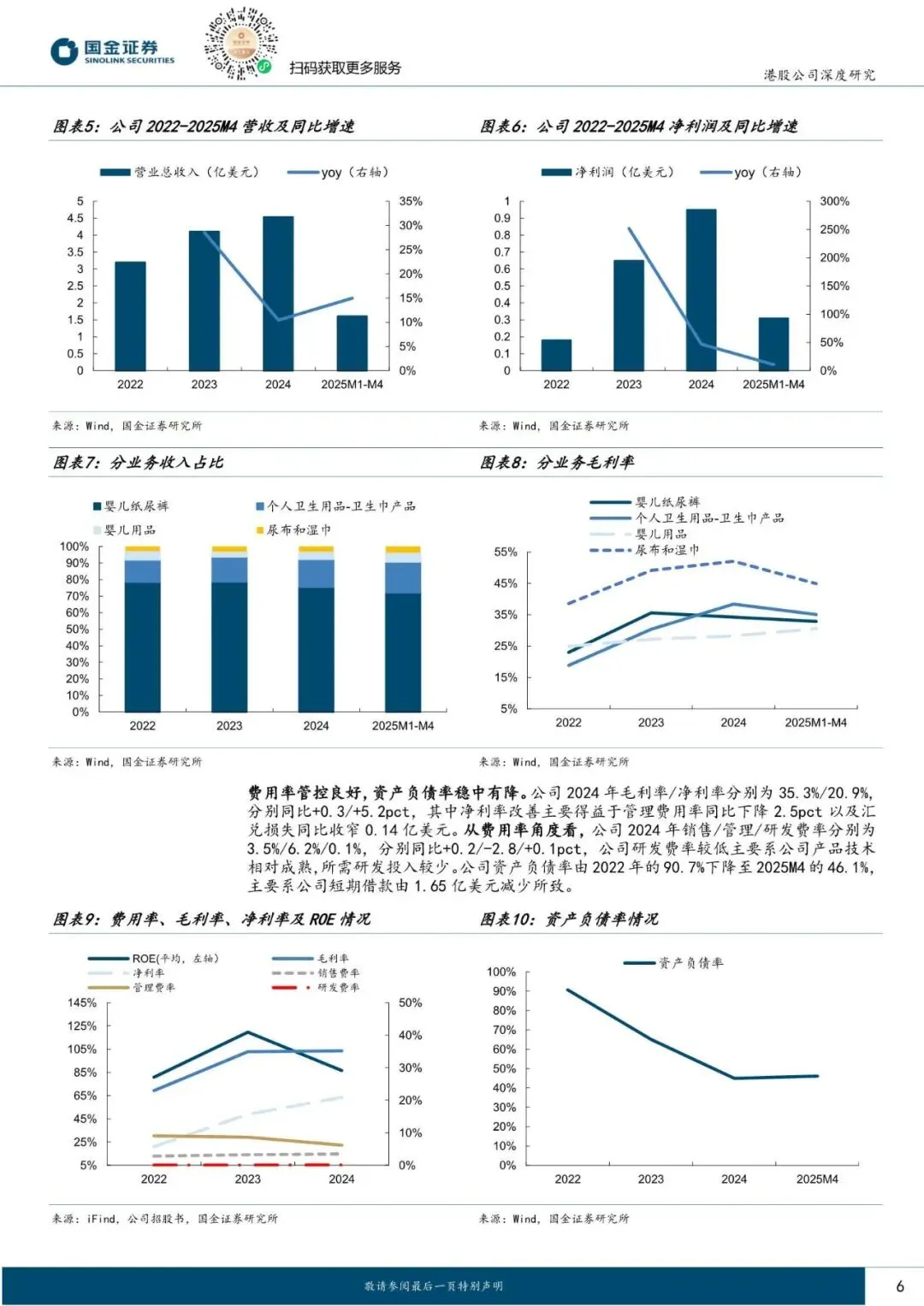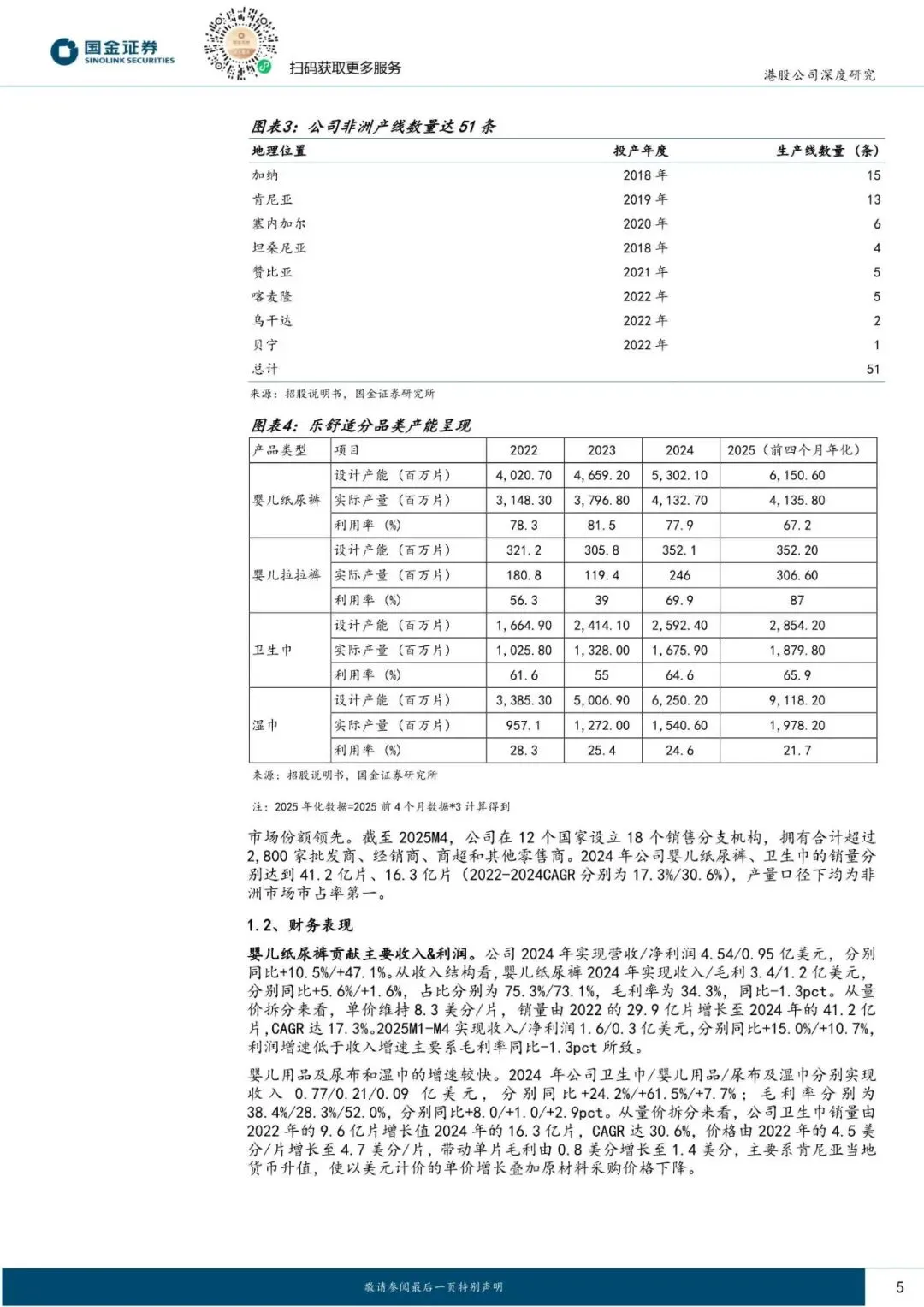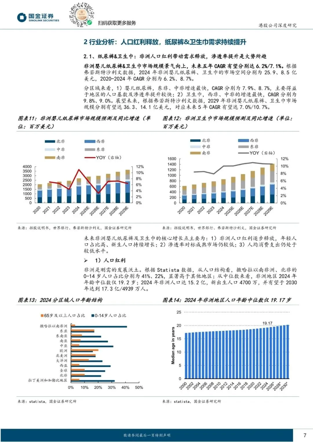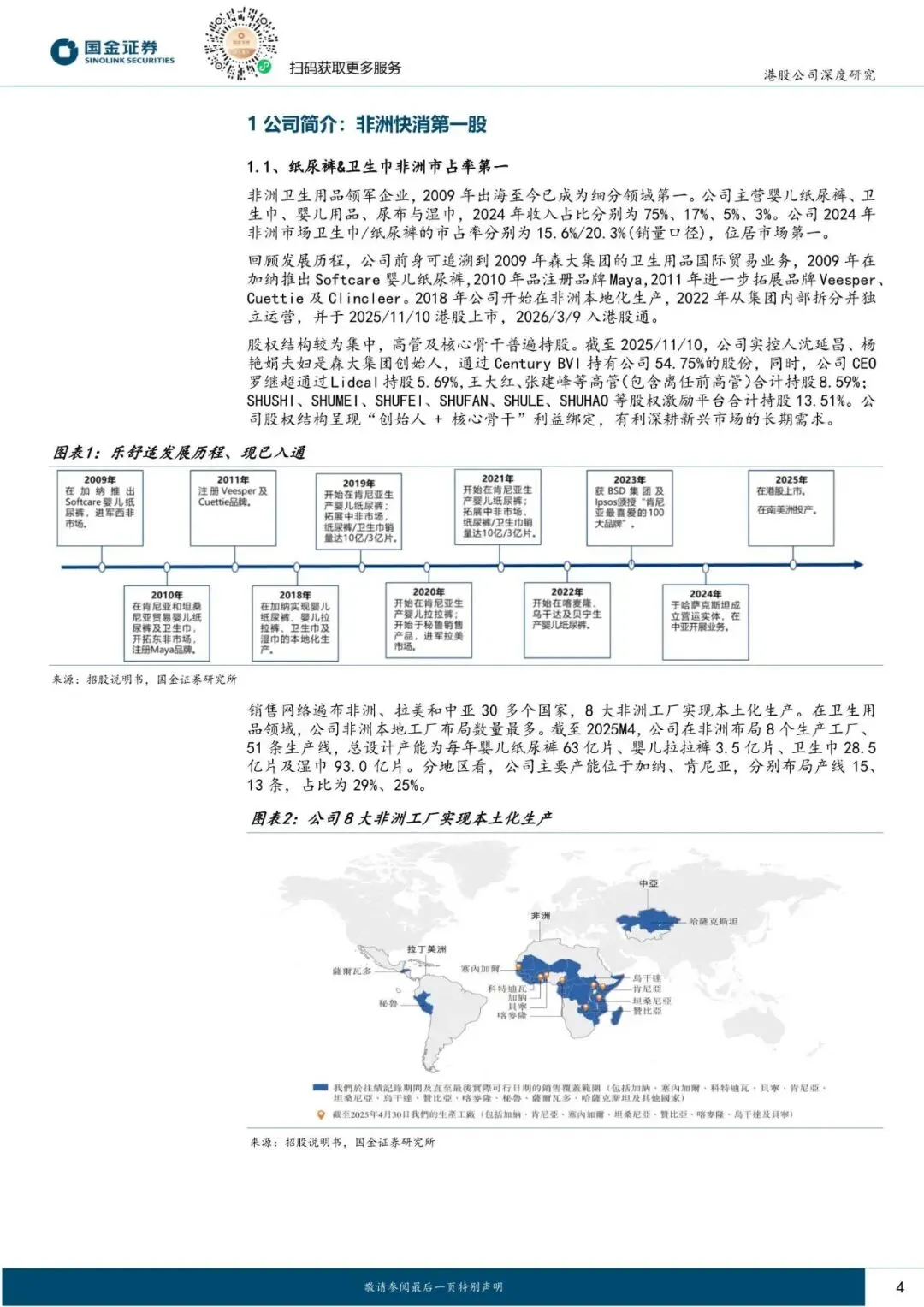 公司主营业务为婴儿纸尿裤、卫生巾,2024 年收入占比为 75%、17%;西非、东非为公司优势地区,收入占比接近 90%。根据公司招股书,2024 年非洲市场卫生巾/纸尿裤的市占率分别为15.6%/20.3%(销量口径),位居市场第一。公司 2025/11/10 在港交所上市,在 2026/3/9 入通。