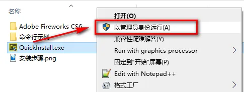 2.选中QuickInstall,鼠标右键选择 “以管理员身份运行”
