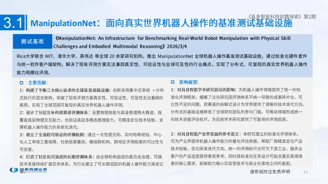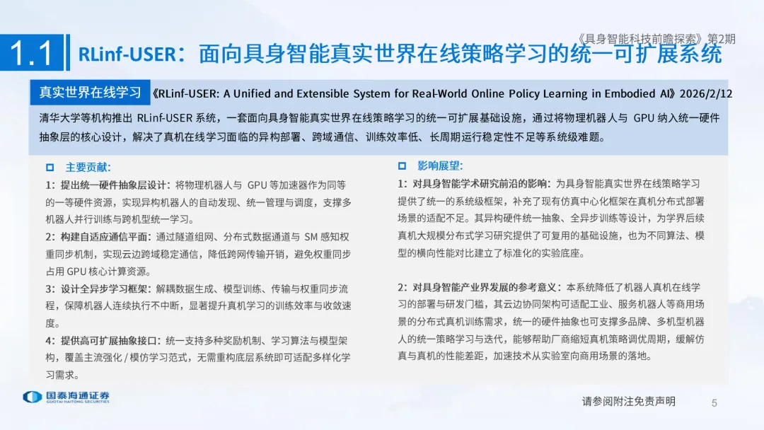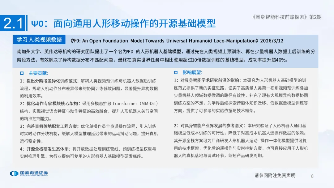 人形机器人已成为中国硬科技的新名片,在国际舞台大放异彩,但受限于大脑能力及量产成本等因素,距大规模应用仍有显著差距。把握产业脉络,需紧跟一线技术动态,国泰海通产业团队推出具身智能科技前瞻探索系列研究,跟踪学术前沿解读最新论文成果,为产业发展和投资决策提供最前瞻视角。