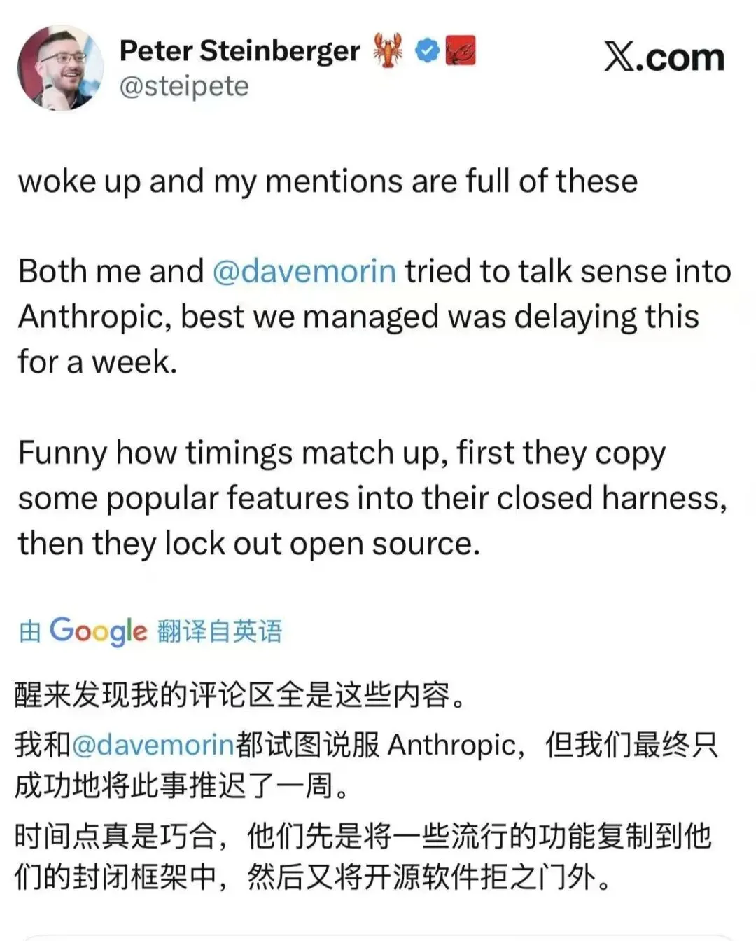 Peter Steinberger回应:"先把我们的功能抄进封闭框架,再把开源的我们踢出去。"