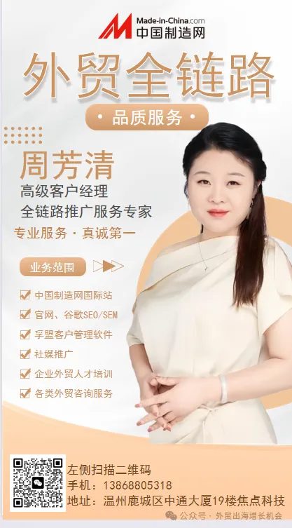 大家好,我是你们的外贸老朋友—中国制造网周芳清