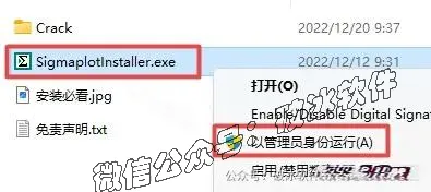 2.打开刚刚解压的文件夹,鼠标右键点击“SigmaplotInstaller.exe”选择“以管理员身份运行”