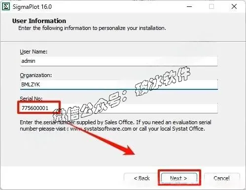 5.输入信息及序列号Serial No:775600001,点击”Next”