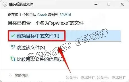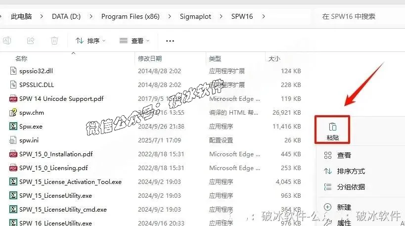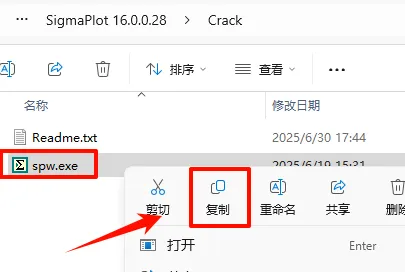 11.返回之前解压的“SigmaPlot 16.0.0.28”文件夹,双击打开“Crack”文件夹,选中“spw.exe”文件,鼠标右键选择“复制”